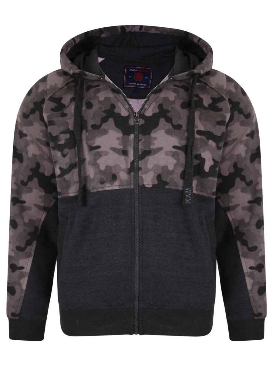 Hupullinen maastokuvioitu huppari, jonka etupuolella vetoketju, 2 sivutaskua ja hupussa kiristysnauhat.