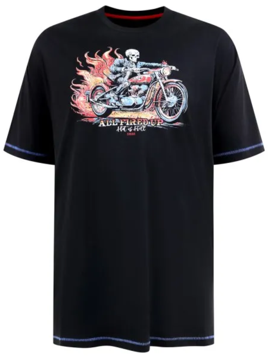 Mustassa paidassa printti, jossa luuranko ajaa moottoripyörällä liekkien läpi.