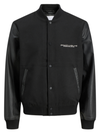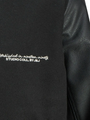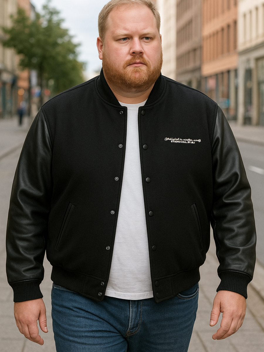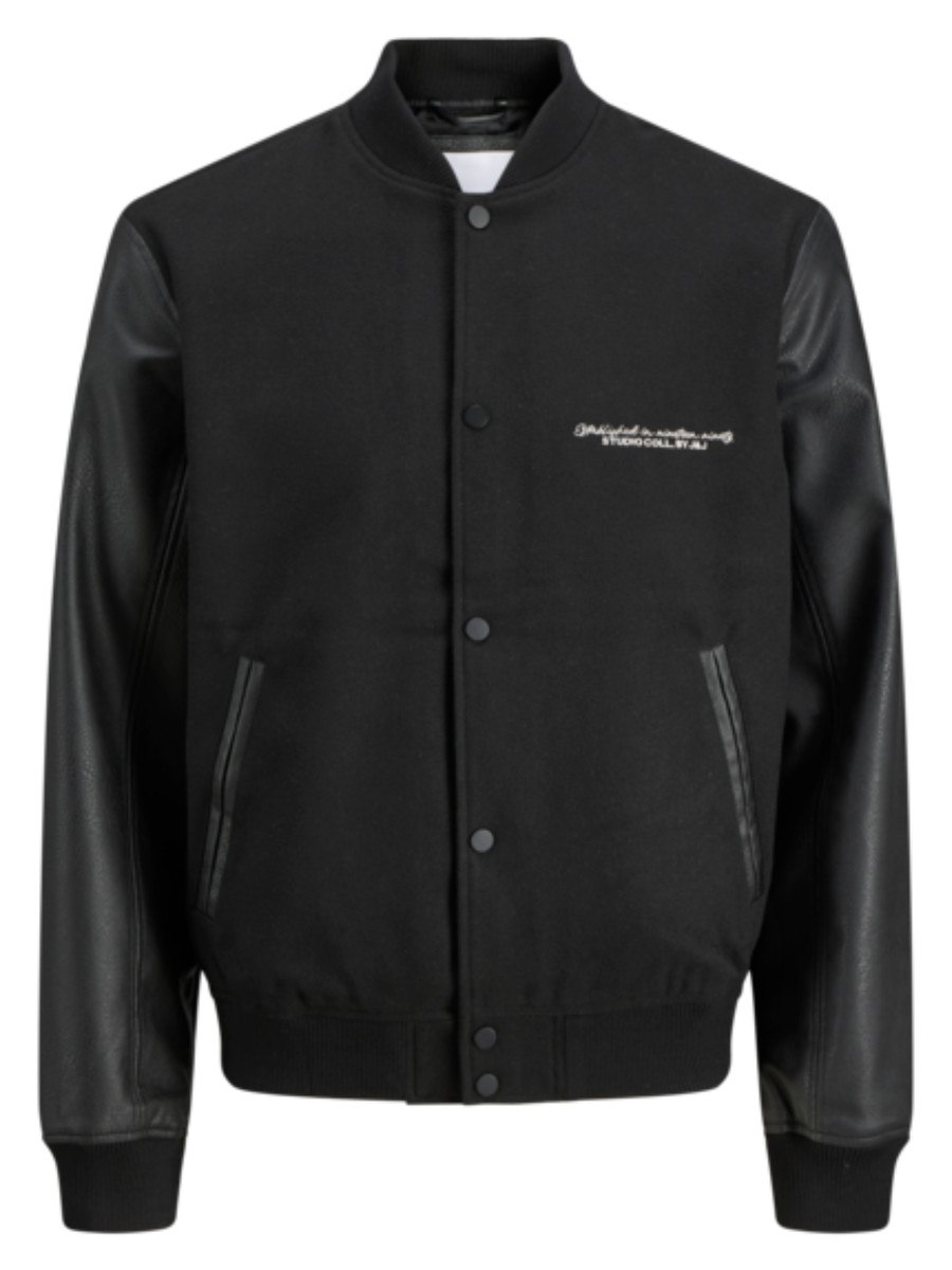 Tyylikäs, mutta rento musta villasekoite bombertakki, jossa keinonahkaiset hihat ja liukas sisävuori. Alareunassa ja hihoissa resorit. Edessä nappikiinnitys, avonaiset sivutaskut ja povitasku. Rintamusta koristaa pieni teksti.